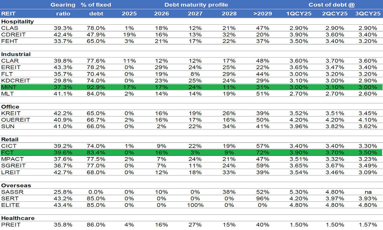 I highlighted my current position in SG REIT – Mapletree Industrial Tr (MINT) and Frasers Centrepoint Tr (FCT). MINT is going to refinance 34% of their total debt between 2025 & 2026. While FCT is refinancing 16% of their total debt in 2026.