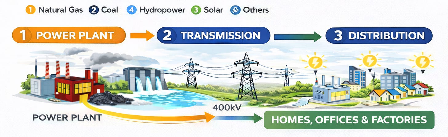 Electricity moves through five main stages — from power generation to billing, with clear roles for procurement, transmission, distribution, and retail.