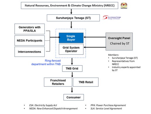 “Single Buyer (SB)” is an operating model where the procurement of power generation from TNB Genco and IPPs are done centrally. Basically, SB manages the electricity demand forecasting, schedules power dispatch from generators based on a merit order (lowest cost first) and administers the PPAs or SLAs with various power producers.