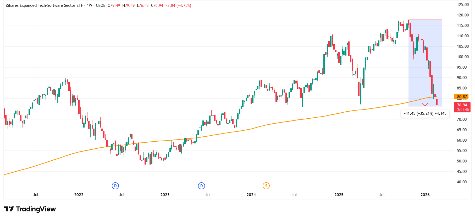 IGV dropped another 11% over the next 3 days to 5th Feb. At the time of writing, the ETF has been consolidating within range $76.3 and $86.1.