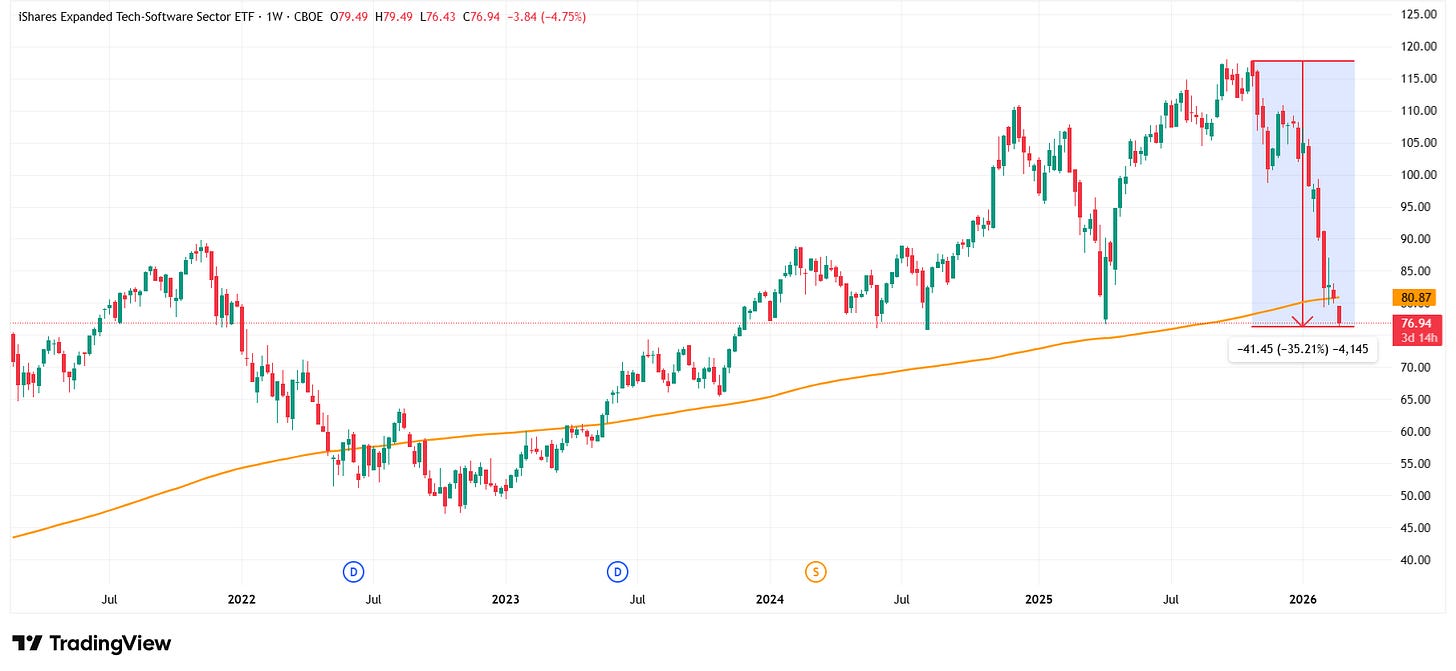 When I look at the software sector ETF (IGV), which I use as a proxy for the broader software market, it is down ~35% since October 2025. This firmly places the sector in bear market territory: